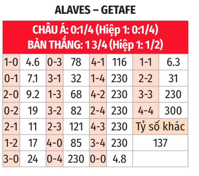 - Alaves thắng hiệp 1 theo châu Á: Trong khi Getafe thua hiệp 1 theo châu Á ở 5/7 trận sân khách gần nhất, thì Alaves lại thắng hiệp 1 theo châu Á ở cả 4 trận vừa qua. Căn cứ vào thực tế trên, các nhà đầu tư nên ủng hộ đội chủ nhà trước giờ nghỉ.