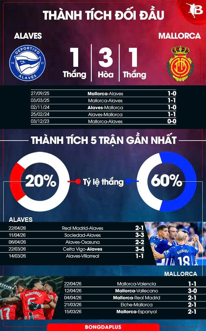 Tại sân nhà Mendizorroza, Alaves giành được 21 điểm sau 15 trận từ đầu mùa – thành tích đủ để tạo điểm tựa trong cuộc đua trụ hạng. Ngoài ra, họ cũng từng đánh bại Mallorca 1-0 ở lượt đi mùa giải 2024/25 trên sân nhà. Đó là chiến thắng thứ 5 trong 7 lần gần nhất tiếp đón Mallorca tại Mendizorroza (hòa 1, thua 1), cho thấy ưu thế nhất định về mặt đối đầu.