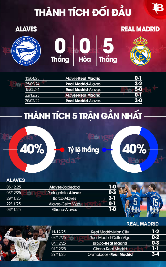 Nhận định bóng đá trận Alaves vs Real Madrid diễn ra vào lúc 03h00 ngày 15/12 trong khuôn khổ vòng 16 La Liga 2025/26. Bongdaplus phân tích thông tin lực lượng, đội hình dự kiến, dữ liệu chuyên sâu, dự đoán tỉ số.