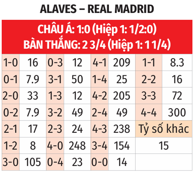 • Lẻ bàn thắng: 17/21 trận đối đầu trước đó giữa Alaves vs Real Madrid có tổng bàn thắng không chia hết cho 2. Ngoài ra, 9/12 trận vừa xong của Alaves và 7/10 trận vừa qua của Real Madrid đều chứng kiến điều tương tự.