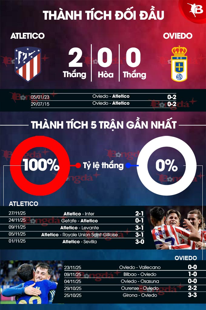 Ngoài ra, Atletico đã đánh bại Oviedo ở 2 lần gặp nhau vừa qua. Chưa hết, họ còn có kinh nghiệm và đội hình cực mạnh. Do đó, nhiều khả năng Atletico sẽ có niềm vui trước đội khách.