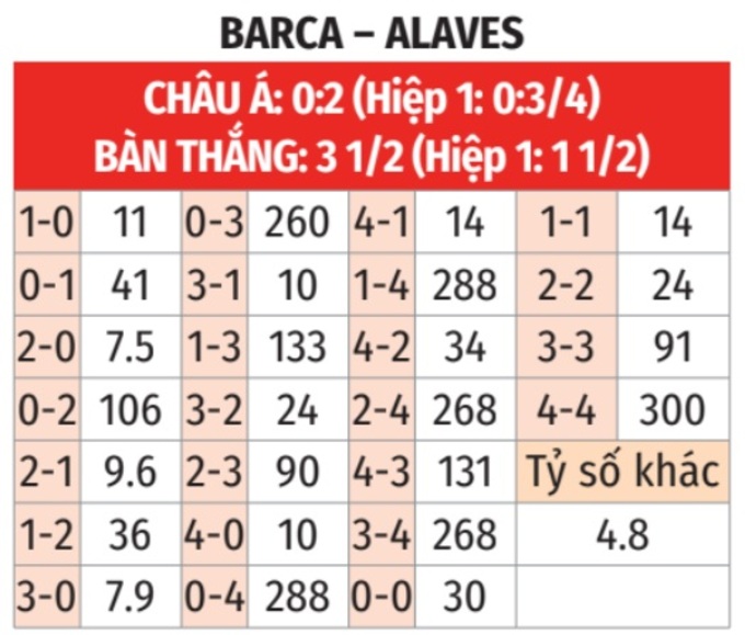 - Lẻ bàn thắng: 4/5 lần gặp giữa 2 đội gần đây kết thúc với tổng số bàn thắng là số lẻ. 7/10 trận sân nhà gần đây của Barca tại các giải chính thức và 5 trận gần nhất của Alaves xảy ra tình trạng tương tự.