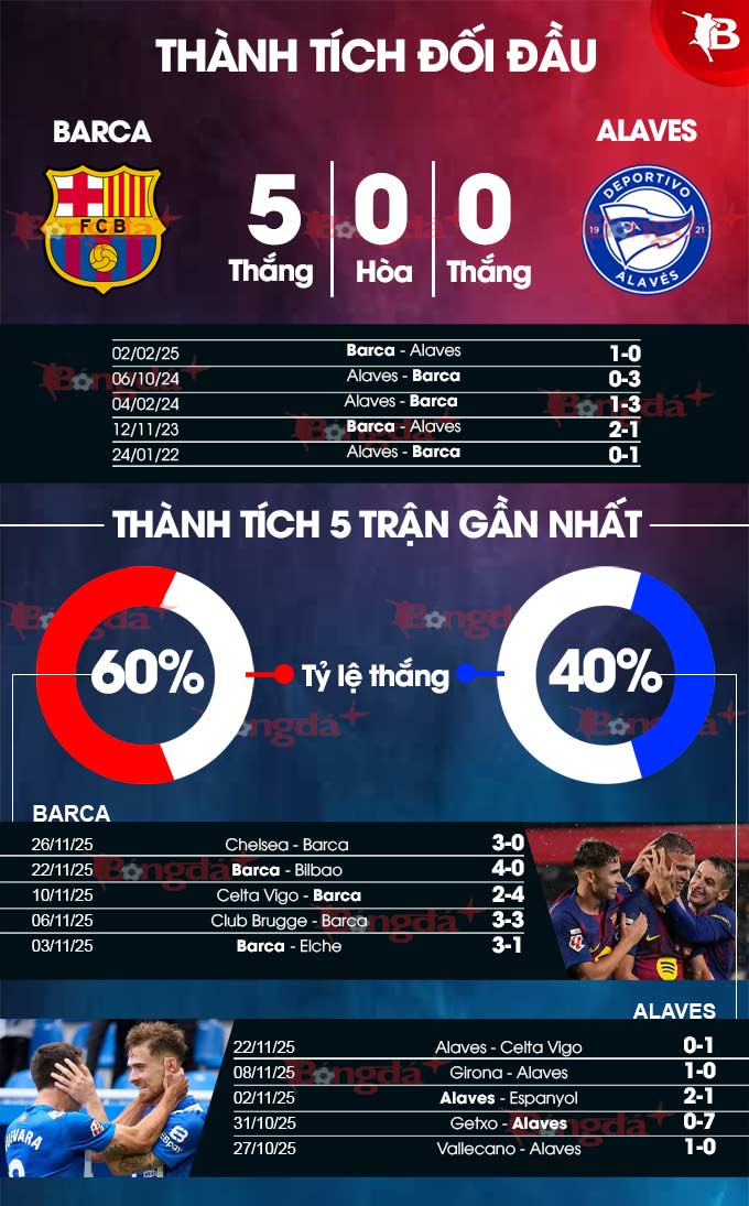 Nhìn chung, Barca có đội hình rất chất lượng, với hàng công toàn hảo thủ như Lamine Yamal, Raphinha, Marcus Rashford, Robert Lewandowski… Cộng với lợi thế sân nhà, họ có lý do để tin tưởng sẽ nghiền nát Alaves. Quan trọng là đối thủ của thầy trò HLV Hansi Flick không mạnh và đang có vấn đề. Theo thống kê, Alaves thua 3/4 trận đấu gần đây ở La Liga mà không ghi nổi bàn thắng danh dự.