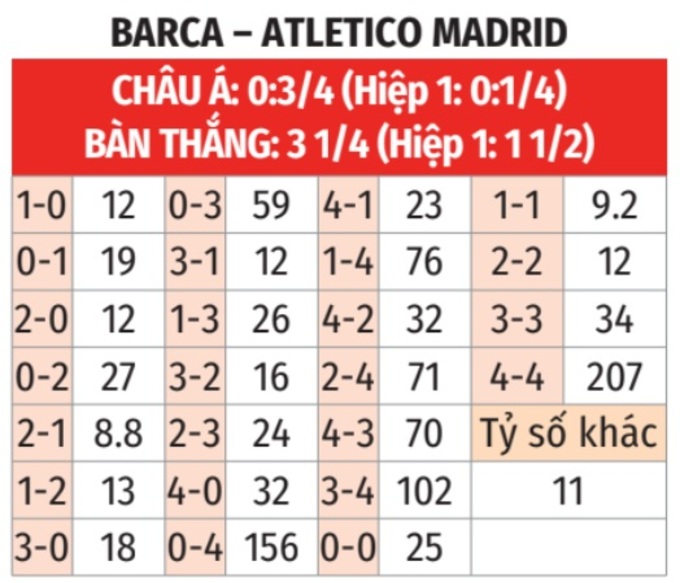 - Tối thiểu 5 góc hiệp 1: 8/9 trận đấu gần đây của Barca đều xuất hiện từ 5 quả phạt góc trở lên trong hiệp 1. Tình trạng tương tự xảy ra ở 3/4 trận mới nhất của Atletico.