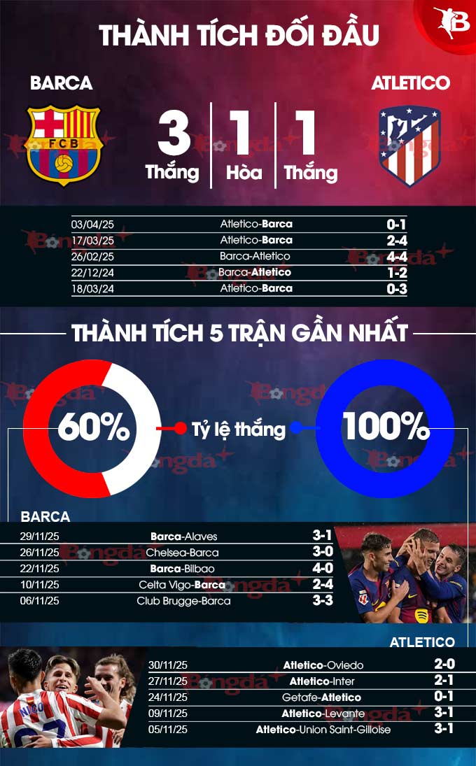 - Hai đội đều ghi bàn: Barca ghi bàn ở 18/19 trận gần đây. Atletico cũng liên tiếp nổ súng trong 14 trận vừa qua ở La Liga. 2 đội đều ghi bàn ở 3/4 lần đụng độ gần nhất.