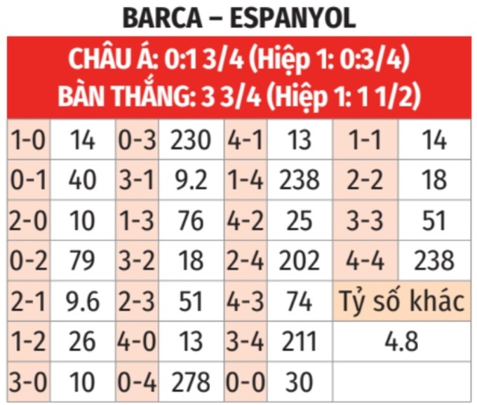 - Tối thiểu 2 bàn hiệp 1: 5/7 trận đấu sân nhà gần đây của Barca có từ 2 bàn thắng trở lên trong hiệp 1. Tình trạng tương tự xảy ra ở 6/9 trận vừa qua của Espanyol.