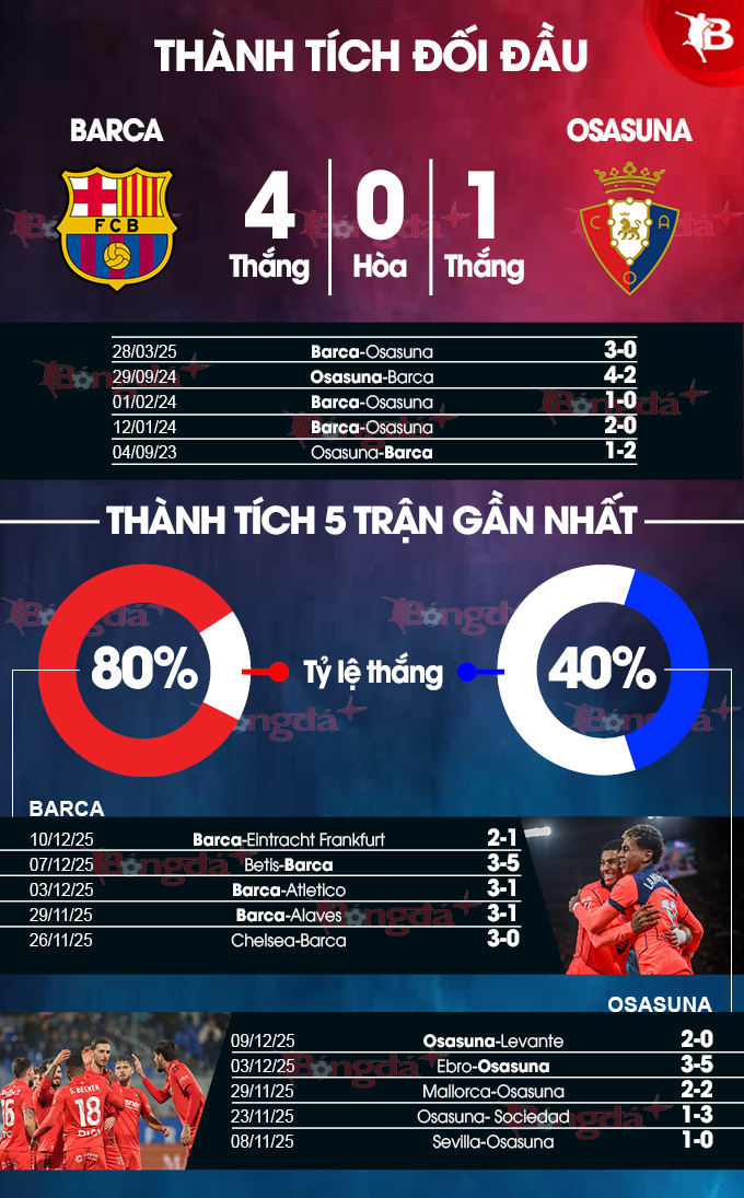 Barca có thói quen đánh bại Osasuna khi được thi đấu trên sân nhà. Bằng chứng là trong 20 trận tiếp đón đối thủ này tại các giải chính thức trong thời gian gần đây, họ thắng 17, hòa 1, chỉ phải nhận 2 thất bại. Trong đó, 6 trận liên tiếp vừa qua với tư cách chủ nhà, Barca đều thắng và không để Osasuna có bàn danh dự ra về.