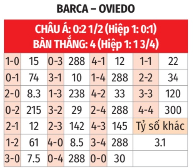 Đương nhiên, dù Oviedo cố gắng, họ cũng sẽ khó gây bất ngờ trên sân của Barca. Nhiều khả năng, đội khách sẽ phải ra về trắng tay. Vấn đề chỉ là các học trò của ông Hansi Flick thắng với cách biệt mấy bàn. Theo quan sát, trong hầu hết các cuộc đụng độ gần đây, Barca thường bị Oviedo gây khó khăn rất nhiều. Vì thế, không loại trừ khả năng ở trận này, đội chủ nhà chỉ có thể thắng với cách biệt tối đa 2 bàn.