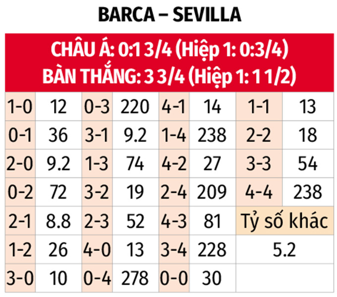 - Barca thắng châu Á: Trên sân nhà, Barca đang có mạch 6 trận liên tiếp thắng châu Á. Màn tiếp đón Sevilla tại Camp Nou mùa giải trước cũng chứng kiến Barca nhường 1 3/4 trái như trận này và hủy diệt đối thủ 5-1. Tính xa hơn, Barca toàn thắng châu Á 3 trận đối đầu gần nhất trên sân nhà và nhường tỷ lệ tương tự trận này.