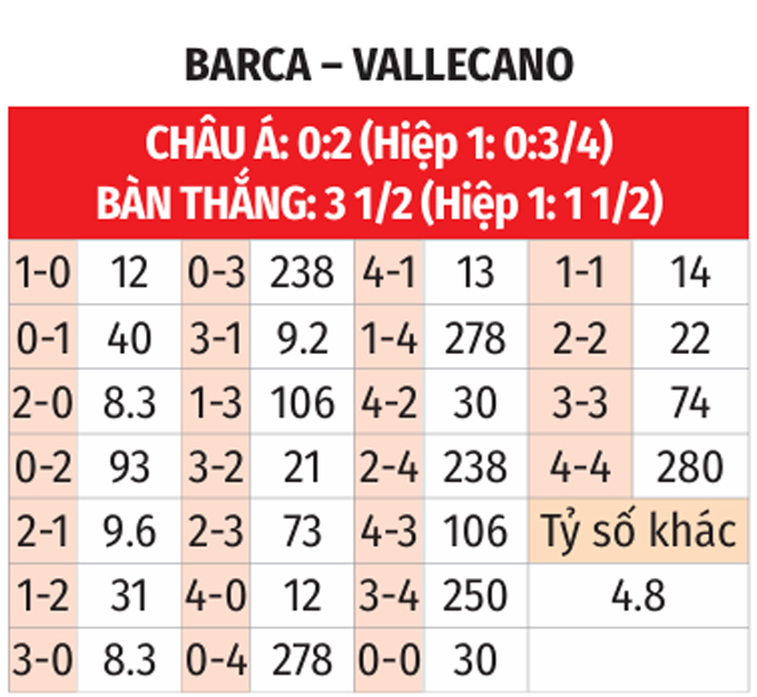 Phong độ của Barcelona vs Vallecano đang rất khác biệt. Chưa hết, Vallecano cũng đang chơi dở ở sân khách và ngại đến Camp Nou. Khả năng cao, 3 điểm sẽ về tay Barca.