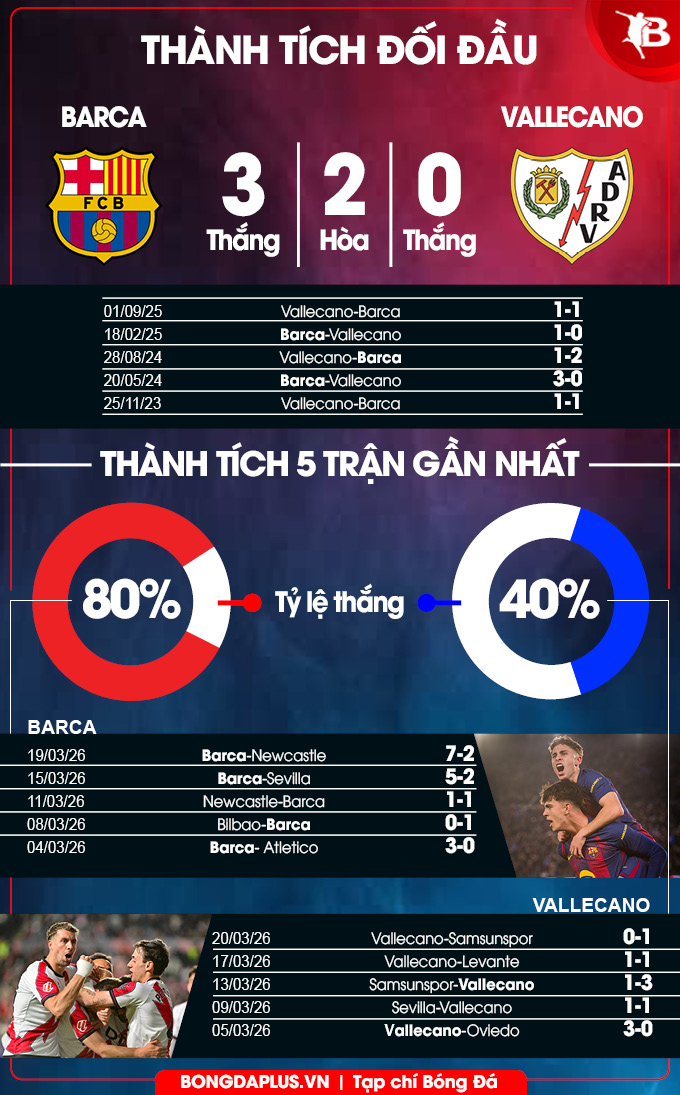 Họ thắng 3, hòa 4 và thua 1 ở 8 trận gần nhất. Trong khi đó, Barca thắng 7, hòa 1 và thua 2. Rõ ràng, Barca đang hơn đứt đối thủ về phong độ. Riêng 8 lần gần nhất gặp Barca, Vallecano thắng 2, thua 3 và hòa 3.