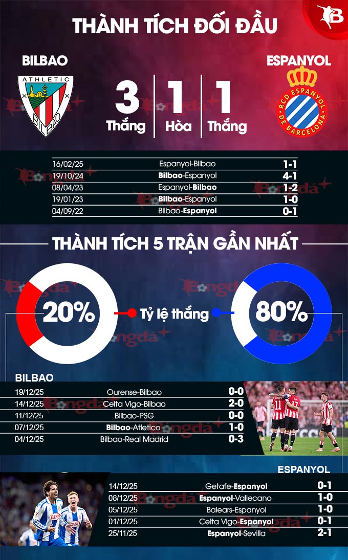 - Tối đa 2 bàn cả trận: 8/10 trận đấu gần đây của Bilbao đều kết thúc với tối đa 2 bàn thắng. Tình trạng tương tự xảy ra ở 5/6 trận vừa qua của Espanyol.