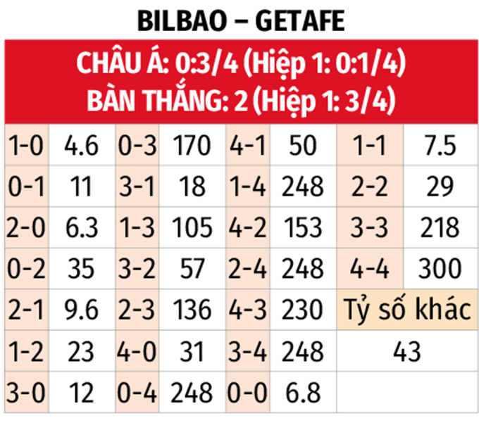 - Tối đa 2 bàn thắng: 4/6 trận sân nhà gần đây của Bilbao cùng 4 trận liên tiếp vừa qua của Getafe đều có không quá 2 bàn thắng được ghi. 3 trận đối đầu gần nhất cũng xuất hiện nhiều nhất 2 pha làm bàn.