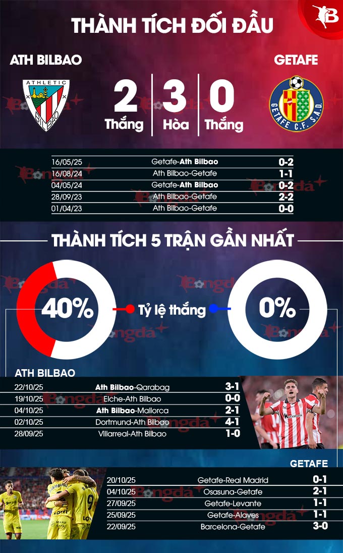 Bilbao có thành tích gần đây tốt trước Getafe và đã giành chiến thắng 13 trong số 40 trận đấu gần nhất giữa hai đội, trái ngược với 8 chiến thắng của Getafe.