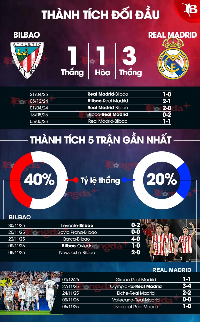 Real Madrid không được phép trượt ngã thêm nữa, nếu không họ hoàn toàn có khả năng sẽ bị Barca “cắt đuôi” trong cuộc đua tới chức vô địch La Liga mùa này. Vì thế, thầy trò HLV Xabi Alonso chắc chắn hành quân đến xứ Basque với quyết tâm giành chiến thắng rất cao. Real Madrid hoàn toàn có lý do để tin tưởng sẽ rời San Mames với 3 điểm.
