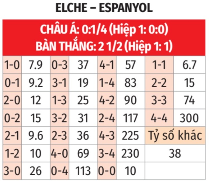 - Tối thiểu 3 bàn thắng cả trận: 6/7 trận đấu sân nhà gần đây của Elche đều kết thúc với tối thiểu 3 bàn thắng. Tình trạng tương tự xảy ra ở 5 trận gần nhất của Espanyol.