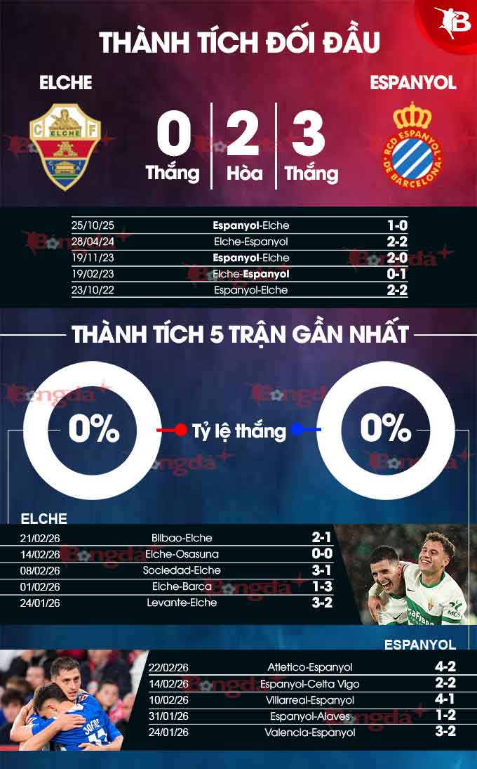 Nên nhớ rằng, Espanyol đang xếp vị trí thứ 7 ở La Liga. Họ đứng trên Elche tới 10 bậc tại bảng xếp hạng. Quan trọng là đội bóng xứ Catalunya có sự ủng hộ của quá khứ. Cụ thể, trong 5 lần chạm trán giữa hai đội gần đây, Espanyol vượt trội về thành tích khi thắng 3 và hòa 2 trận.