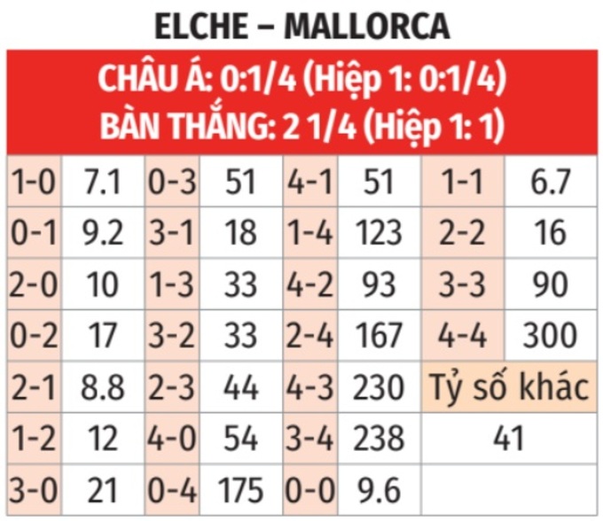 - Lẻ bàn thắng: 3/4 trận đấu gần đây của Elche kết thúc với tổng số bàn thắng là số lẻ. 9/11 trận vừa qua của Mallorca cũng không ngoại lệ.