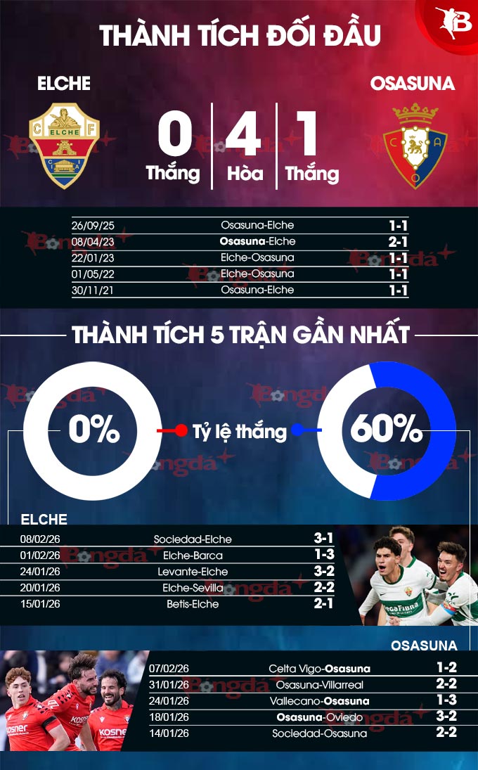 Osasuna đang có phong độ tốt. Họ bất bại 5 trận liên tiếp gần đây tại giải nội địa, bao gồm 3 chiến thắng ở La Liga. Với những kết quả đó, họ vươn lên vị trí thứ 9 tại bảng xếp hạng. Đang “vào phom”, Osasuna có lý do để tin tưởng sẽ có 3 điểm trong chuyến hành quân đến sân của Elche cuối tuần này.