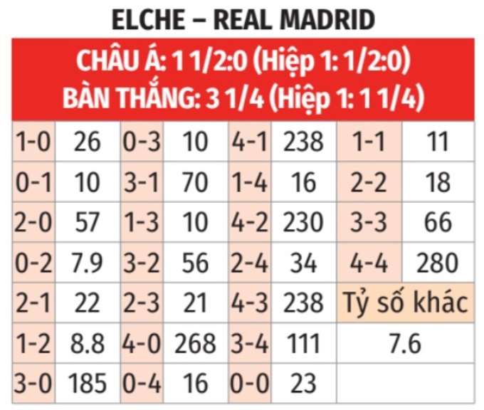 - Tối đa 3 bàn cả trận: 6 lần đối đầu giữa hai đội gần đây trên sân của Elche chỉ xuất hiện tối đa 3 bàn thắng. 8 trận sân nhà gần đây của Elche và 3/4 trận vừa qua của Real Madrid xảy ra tình trạng tương tự.