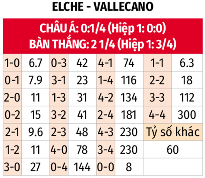 - Hiệp 1 có tối đa 1 bàn thắng: 8/9 trận gần đây của Vallecano đều kết thúc hiệp đầu tiên với nhiều nhất 1 bàn thắng. Bên phần sân đối diện, 4 trận sân nhà vừa qua của Elche thậm chí chỉ có vỏn vẹn 1 bàn thắng trong 45 phút đầu.