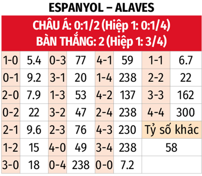 - Espanyol thắng châu Á: Thành tích sân nhà gần đây của Espanyol trước Alaves khá tốt, với 5 chiến thắng và 1 trận hòa trong 6 lần gặp nhau gần nhất. Kết hợp với phong độ sa sút trên sân khách gần đây của Alaves, đội chủ nhà dường như có lợi thế hơn trong việc kiểm soát nhịp độ trận đấu và giành chiến thắng.