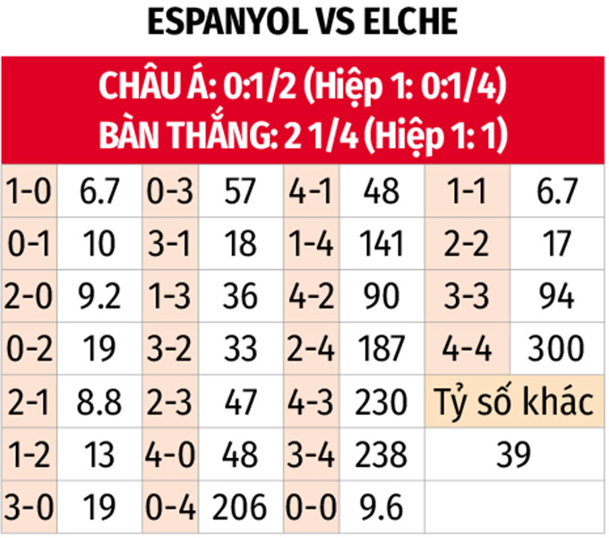 - Elche thắng theo châu Á: Các cầu thủ Elche đang rất có duyên với mức tỷ lệ được nhường 1/2 trái như trận này, khi 3 trận từ đầu mùa xuất hiện họ đều từ hòa đến thắng về chuyên môn. Với Espanyol, đội chủ nhà chỉ thắng châu Á 1/5 trận vừa qua, để thua 3/4 trận đối đầu gần nhất trên sân nhà.