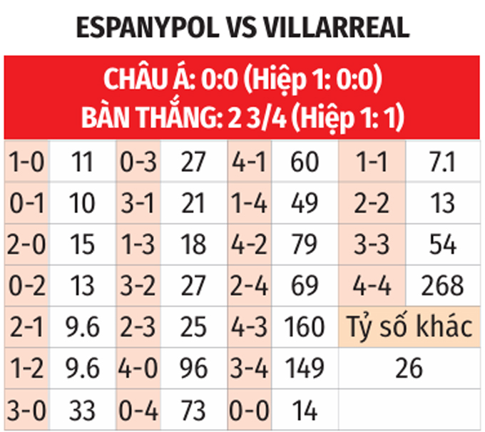 - Ít nhất 1 bàn ở hiệp 1: 3/5 trận chính thức gần nhất giữa Espanyol và Villarreal có tối thiểu 1 lần lưới rung hiệp 1. 3/5 trận chính thức vừa xong của Espanyol và 4/5 trận mới đây của Villarreal có kịch bản tương tự. NHM nên đợi sau 15 phút đầu thì đặt niềm tin vào nhiều bàn hiệp 1.