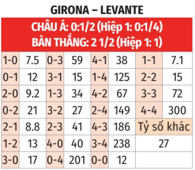 - Xỉu hiệp 1: 9 lần đối đầu giữa 2 đội gần đây chỉ có tối đa 1 bàn thắng trong hiệp 1. 6/7 trận sân nhà gần đây của Girona và 4 trận sân khách vừa qua của Levante xảy ra tình trạng tương tự.