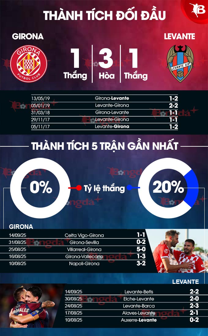 Quan trọng là Levante có sự ủng hộ của lịch sử. Thống kê chỉ ra rằng, trong 6 chuyến hành quân gần đây đến sân của Girona ở các giải đấu chính thức, họ luôn áp đảo chủ nhà. Cụ thể, Levante thắng 3, hòa 2, chỉ phải nhận duy nhất 1 thất bại.