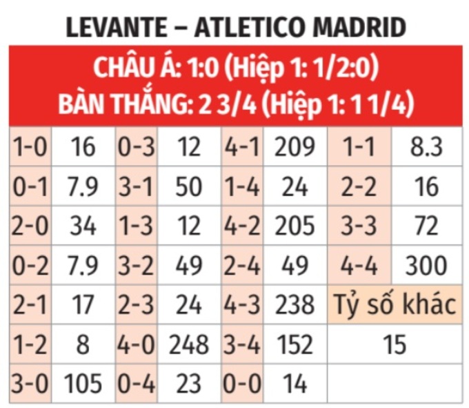 - Tối đa 2 bàn thắng: 5/7 lần chạm trán giữa 2 đội gần đây chỉ có nhiều nhất 2 bàn thắng. Tình trạng tương tự xảy ra ở 8/10 trận gần đây của Levante và 3 trận sân khách gần nhất của Atletico.