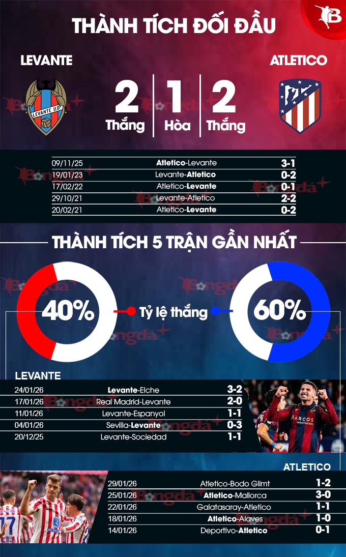 Đặc biệt, Levante thường chơi tốt mỗi khi tiếp đón Atletico trong quá khứ. Thống kê chỉ ra rằng, trong 14 lần tiếp đón đội bóng đến từ thủ đô Madrid ở Ciutat trong khuôn khổ La Liga, Levante thắng 5, hòa 5, chỉ phải nhận 4 thất bại. Với những kết quả tích cực đó, đội bóng của HLV Luis Castro có lý do để vững tin bước vào trận đấu với Atletico.