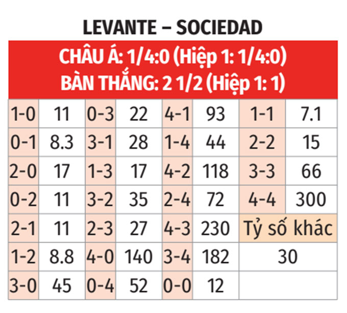 - Ít nhất 4 thẻ vàng: 7/9 trận vừa qua của Levante đều có tối thiểu 4 thẻ vàng. 4/6 trận gần đây của Sociedad số thẻ vàng còn không dưới 5.