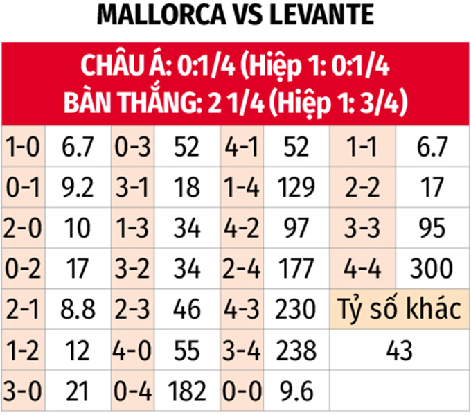 - Levante thắng châu Á hiệp 1: Các cầu thủ Levante giành chiến thắng trong hiệp 1 ở 3 trận liên tiếp vừa qua trên sân khách tại đấu trường La Liga. Với Mallorca, đội bóng này để thua 2, hòa 1 và chỉ thắng 1 trong 4 trận sân nhà vừa qua tại La Liga trước giờ nghỉ.