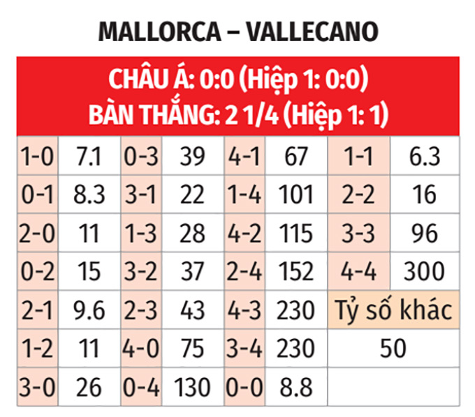 - Tối thiểu 3 bàn: 4/6 trận gần đây giữa Mallorca và Rayo Vallecano đều có tối thiểu 3 bàn. 4 trận vừa qua của Mallorca số lần lưới rung cũng đều cao hơn 2.