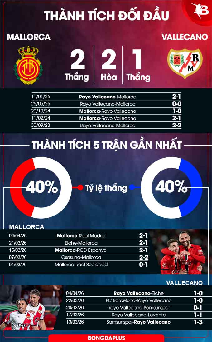 Trong khi đó, Rayo Vallecano dù vừa thắng AEK Athens 3-0 và Elche 1-0, nhưng những con số sân khách lại rất đáng lo. Cụ thể, họ chỉ thu về 3 chiến thắng sau 15 trận và giành vỏn vẹn 12 điểm trong những chuyến hành quân xa nhà mùa này. Đây rõ ràng là điểm yếu chí mạng khi họ phải thi đấu tại sào huyệt của Mallorca đang thăng hoa.