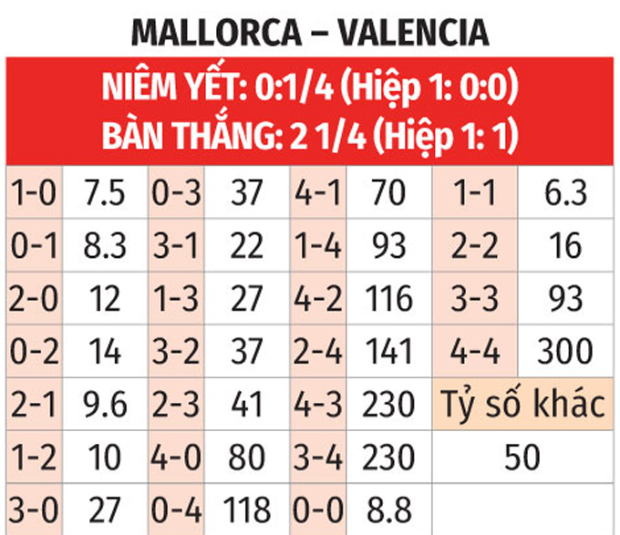- Lẻ bàn thắng: 6/10 trận so tài gần nhất giữa 2 CLB có tổng bàn thắng không chia hết cho 2. Chưa hết, 8/10 trận mới đây của Mallorca lẫn 7/10 trận vừa xong của Valencia cũng chứng kiến điều tương tự.