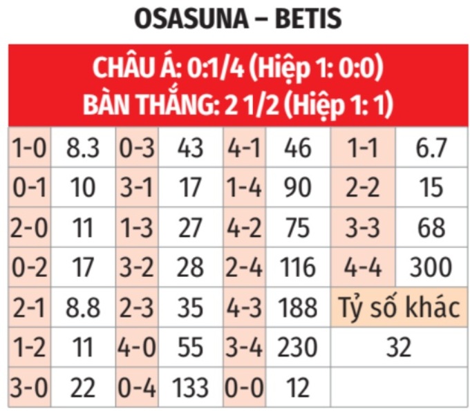 - Tối thiểu 1 bàn hiệp 1: 8/10 lần gặp giữa 2 đội gần đây có từ 1 bàn thắng trở lên trong hiệp 1. Tình trạng tương tự xảy ra ở 9/12 trận gần đây của Osasuna và 13/15 trận mới nhất của Betis.