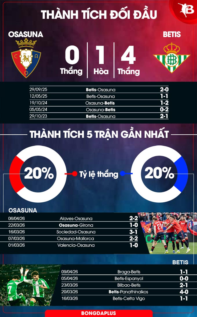 Tuy nhiên, Betis vẫn hành quân đến sân của Osasuna với hy vọng có điểm. Bởi họ có sự ủng hộ của lịch sử. Theo quan sát, trong 5 lần đụng độ giữa 2 đội vừa qua, Betis áp đảo với thành tích thắng 4 và hòa 1 trận.