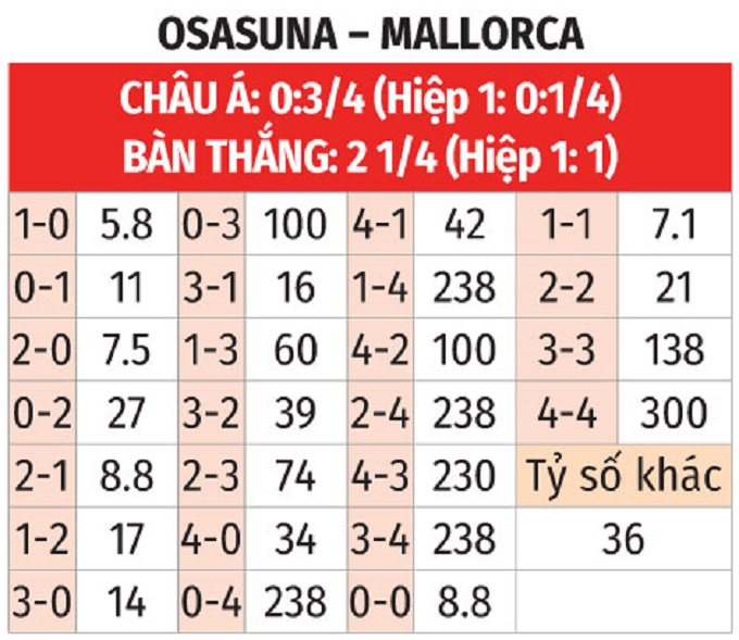 - Lẻ bàn thắng: 3/4 trận gần đây của Osasuna kết thúc với tổng bàn thắng là lẻ. Kịch bản lẻ bàn thắng cũng diễn ra ở 8/9 trận vừa qua của đội khách Mallorca.