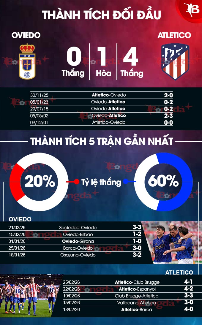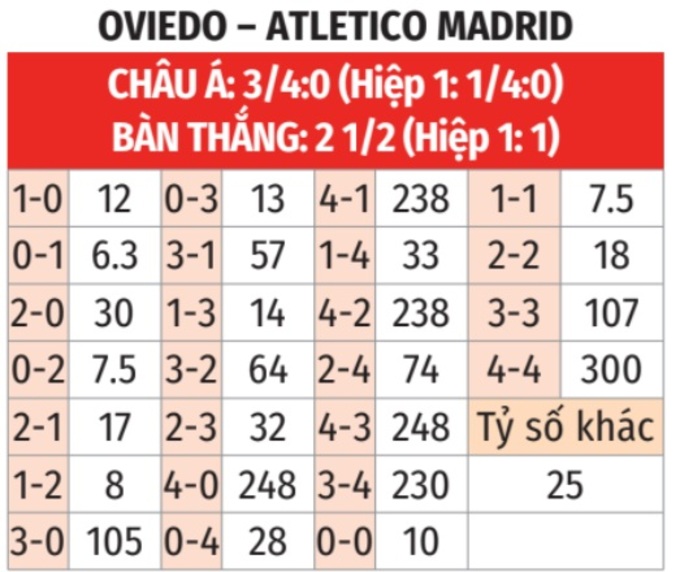 - Tối thiểu 3 bàn thắng: 4/5 trận đấu gần đây của Oviedo đều kết thúc với tối thiểu 3 bàn thắng. Tình trạng tương tự xảy ra ở 5 trận gần nhất của Atletico.