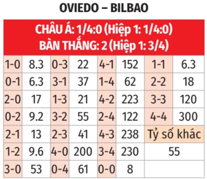 - Ít góc hiệp 1: 3/4 trận đấu gần đây của Oviedo chỉ có tối đa 4 quả phạt góc trong hiệp 1. Tình trạng tương tự xảy ra ở 4/5 trận sân khách vừa qua của Bilbao.