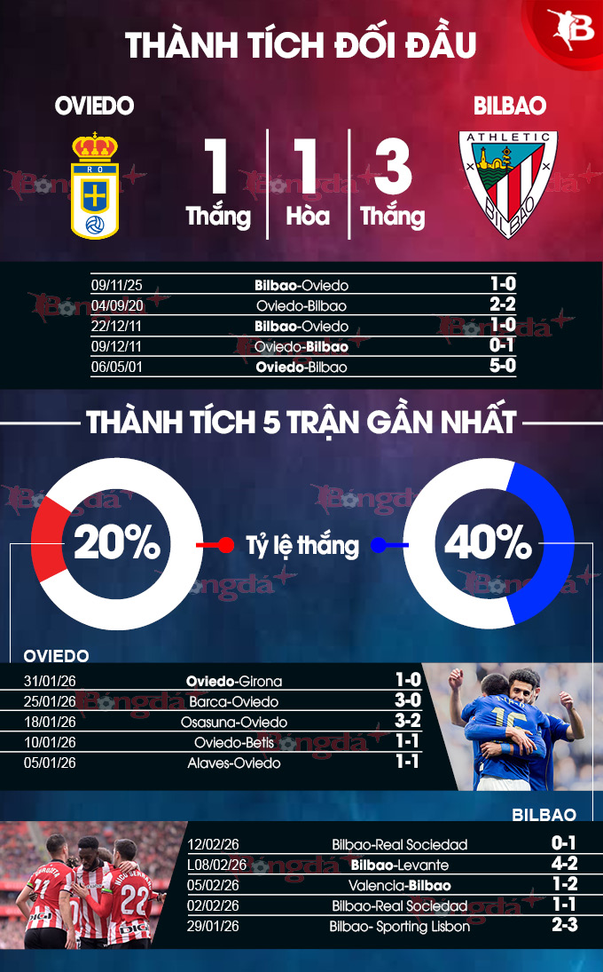 Phải nhấn mạnh rằng, Bilbao luôn át vía Oviedo trong quá khứ. Bằng chứng là trong 3 cuộc chạm trán chính thức, đội bóng xứ Basque áp đảo với 3 trận toàn thắng và không để đối phương ghi bàn thắng danh dự.