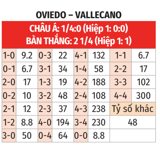 - Oviedo thua theo châu Á: Ở 5 vòng gần đây tại La Liga, Vallecano thắng theo châu Á tới 4 lần. Đá với Oviedo thua theo châu Á 4/6 trận sân nhà vừa qua, các vị khách là sự lựa chọn đáng tin cậy.