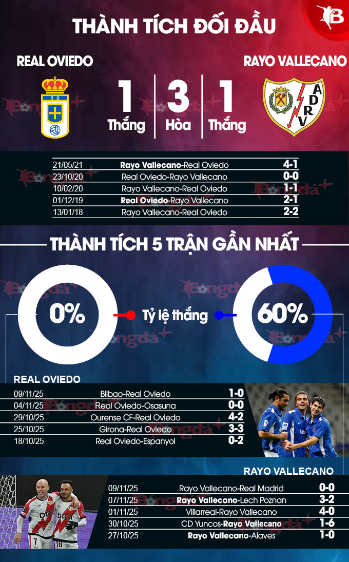 Chỉ kiếm được 1 điểm từ 4 lần tiếp đón các vị khách gần nhất, có thể thấy Oviedo đang tỏ ra kém duyên trên sân nhà. Khi không có điểm tựa đáng tin cậy, rất có thể họ sẽ để cho Vallecano ca khúc khải hoàn.