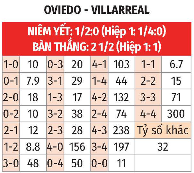 - Lẻ bàn thắng: 7/10 trận gần nhất của Oviedo có tổng bàn thắng không chia hết cho 2. Chưa hết, 8/10 trận mới đây của Villarreal cũng chứng kiến điều tương tự.
