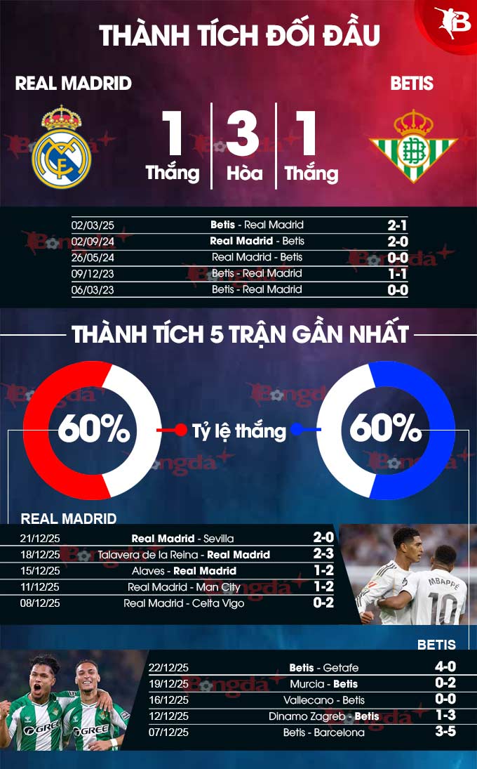 - Hai đội cùng ghi bàn: Real ghi được ít nhất 1 bàn thắng ở 8/9 trận gần nhất, ở 19/20 trận sân nhà vừa qua trên mọi đấu trường. Ngoài ra, Betis cũng làm điều tương tự ở 13/14 trận gần đây, ở 6/7 chuyến làm khách vừa qua. Trận này khó có ngoại lệ.