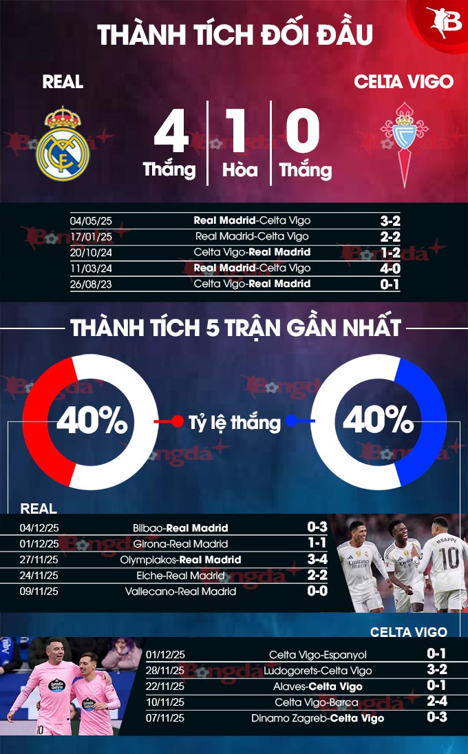 Cũng trên sân nhà, Real Madrid luôn át vía Celta Vigo trong quá khứ. Những con số thống kê không hề biết nói dối. Theo đó, đội bóng thủ đô Madrid đánh bại đối thủ này ở 12/13 lần tiếp đón tại Bernabeu gần đây, và 1 trận còn lại kết thúc với tỉ số bất phân thắng bại. Trong đó, ở chiến thắng 3-2 tại lượt về La Liga mùa trước, tiền đạo Mbappe lập cú đúp vào lưới của đội khách Celta Vigo.