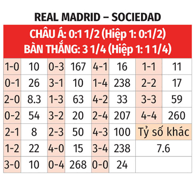 - Tỷ số lẻ: 3/4 trận sân khách gần đây của Real kết thúc với tỷ số lẻ. 3/4 trận gần nhất giữa đội bóng này và Sociedad cũng có số bàn thắng không chia hết cho 2.