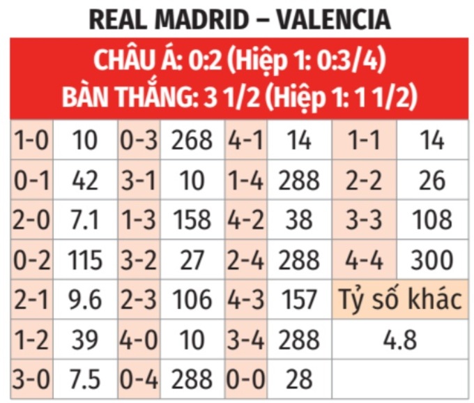 - Tối đa 1 bàn hiệp 1: 7/9 lần gặp giữa 2 đội gần đây chỉ có nhiều nhất 1 bàn thắng trong hiệp 1. 4/5 trận gần đây của Real Madrid và 11 trận vừa qua của Valencia xảy ra tình trạng tương tự.